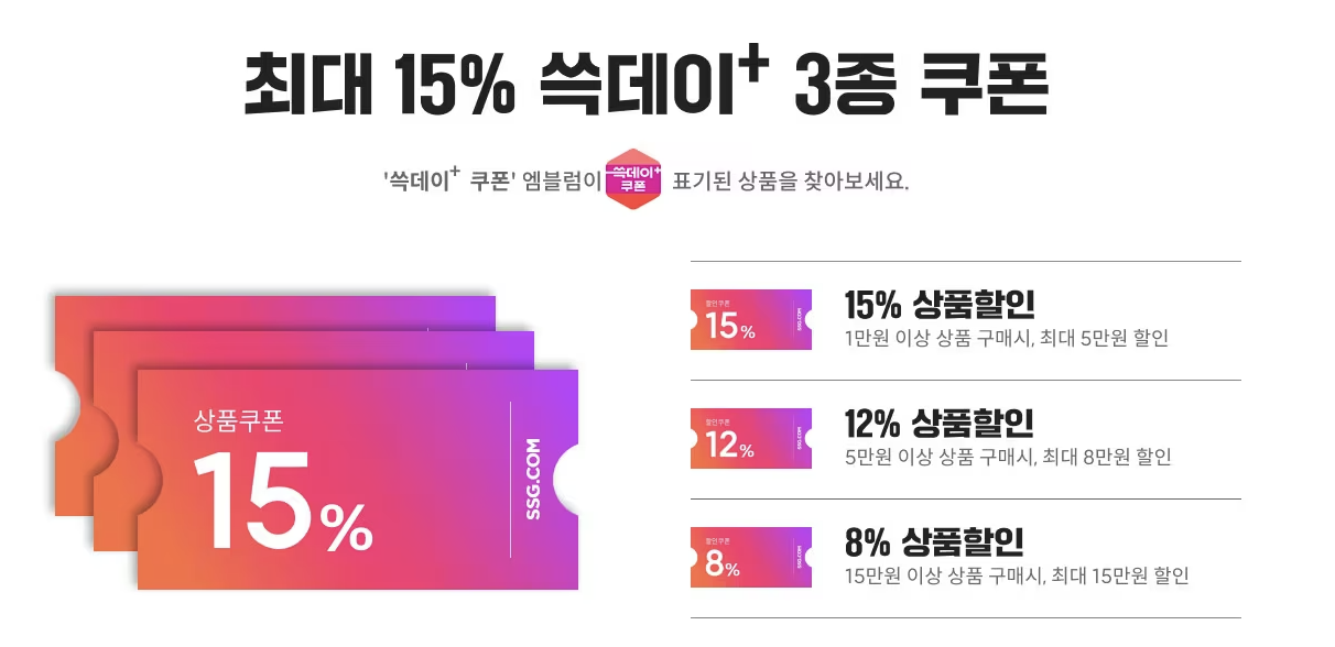 신세계 그룹의 계열사가 총 출동하는 이른바 신세계 블랙프라이데이 기간인 쓱데이가 13일부터 시작됐습니다. 특히 쓱닷컴에서는 쓱데이 할인 기간동안 사용하실 수 있는 쓱데이 쿠폰을 제공하고 있습니다. 최대 15만원까지 할인이 가능한 3종 쿠폰과 백화점과 이마트에서 사용 가능한 선착순 할인 쿠폰까지 제공하고 있습니다. 쓱닷컴에서 받을 수 있는 쓱데이 할인 쿠폰에 청구할인까지 더해 최대 25만 원까지 할인받으실 수 있으니 놓치지 마세요!