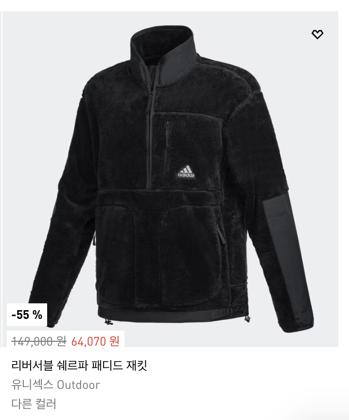 또한 아디다스 겨울 아우터 시리즈 중 인기 품목인 쉐르파 트랙 재킷도 할인 중입니다. 할인가에 블랙프라이데이 30% 할인쿠폰까지 사용 시 최대 65% 할인된 가격인 52,150원에 구매하실 수 있습니다.