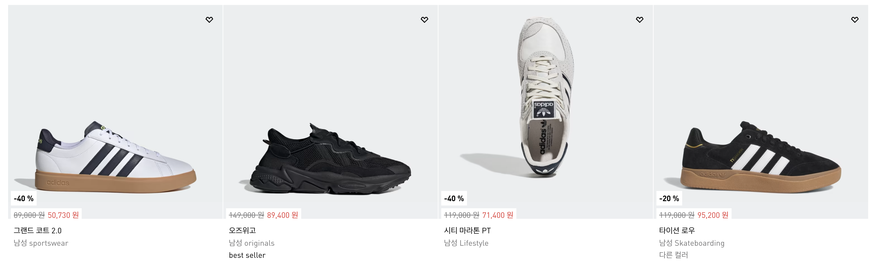 아디다스 베스트 셀러 항목 중 하나인 오즈위고의 경우 40% 할인된 가격인 89,400원에 구매하실 수 있습니다. 또한, 블랙프라이데이 30% 할인쿠폰까지 사용 시 최대 58% 할인된 가격인 62,580원에 구매하실 수 있습니다.