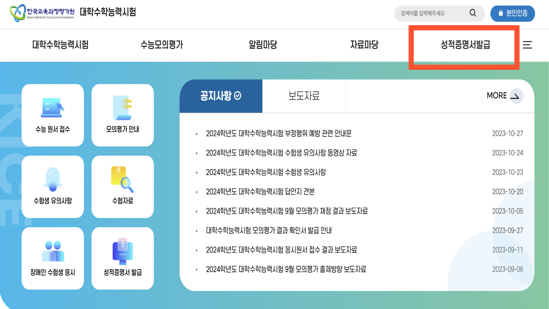 2024학년도 수능의 공식일정에 따르면 최종 성적 통지는 2023년 12월 8일에 발표됩니다. 이후 대학 입시 과정에 필요한 수능성적증명서 발급은 한국교육과정평가원 사이트에서 무료로 받으실 수 있습니다. 수능성적증명서 발급은 국문, 영문 둘 다 가능합니다.