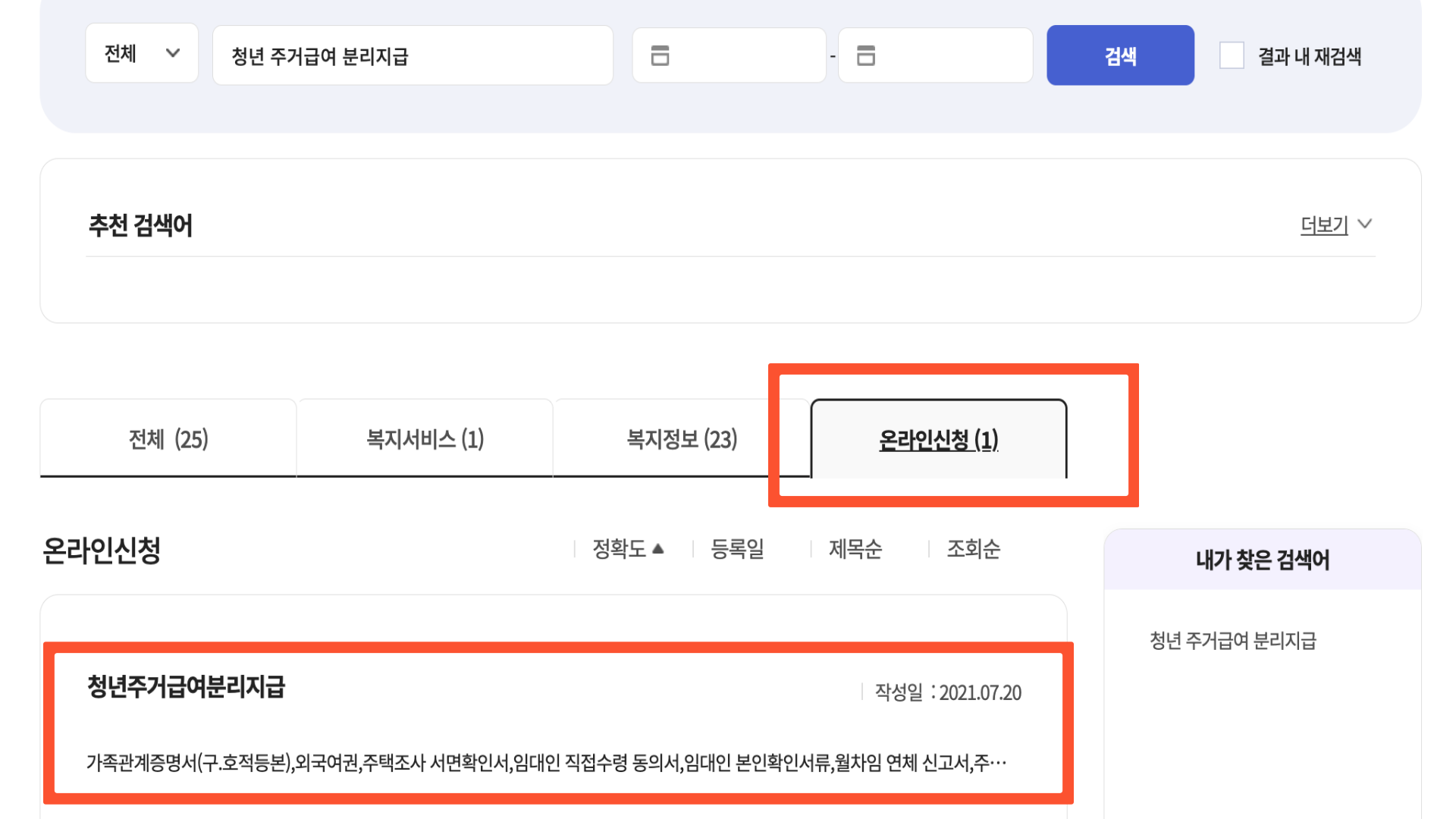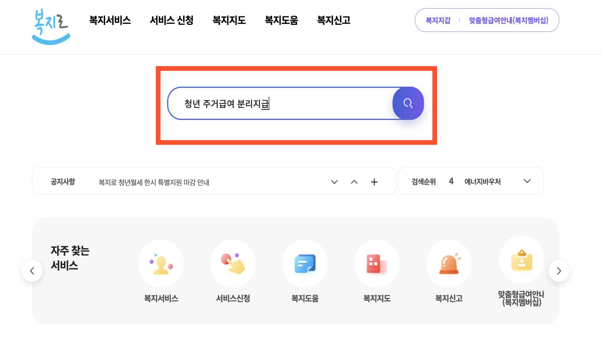 1) 복지로 홈페이지 로그인 후, 청년 주거급여 분리지급 검색