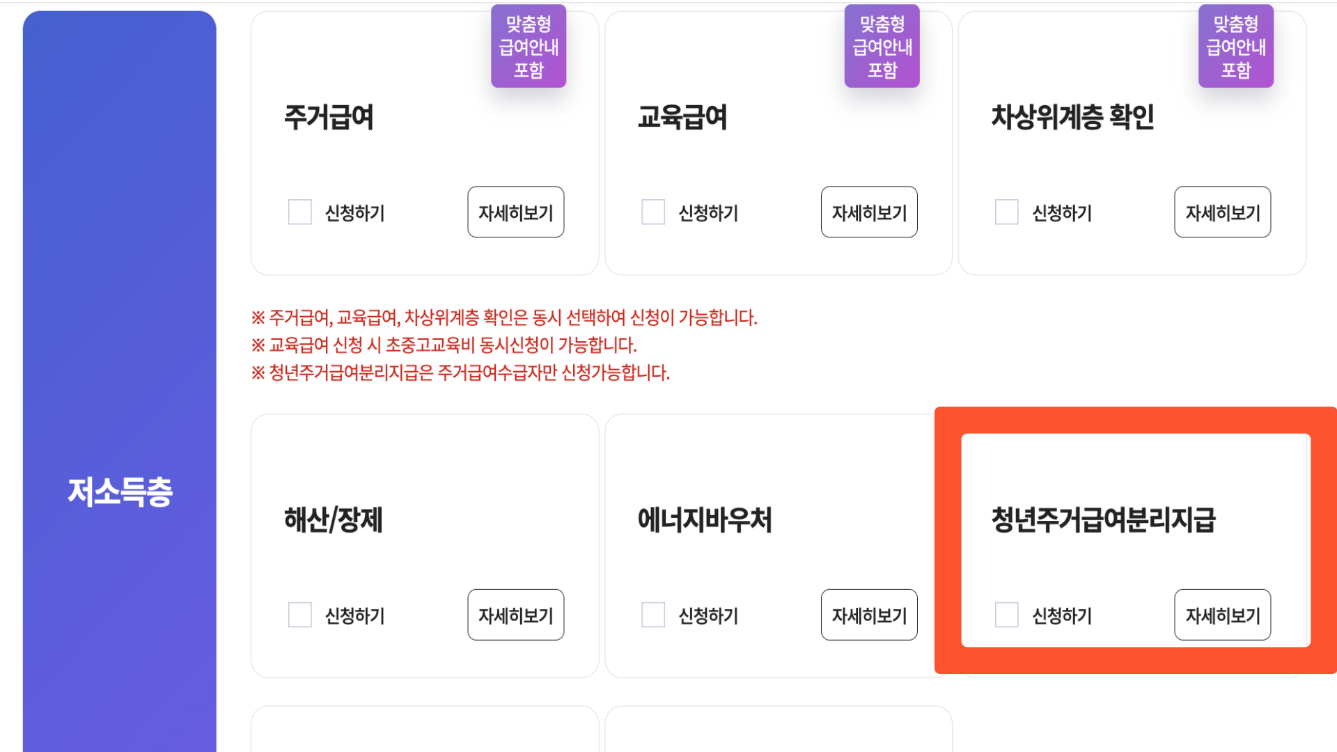 3) 아래로 스크롤 한 후, 저소득층 - 청년주거급여분리지급 신청하기 체크