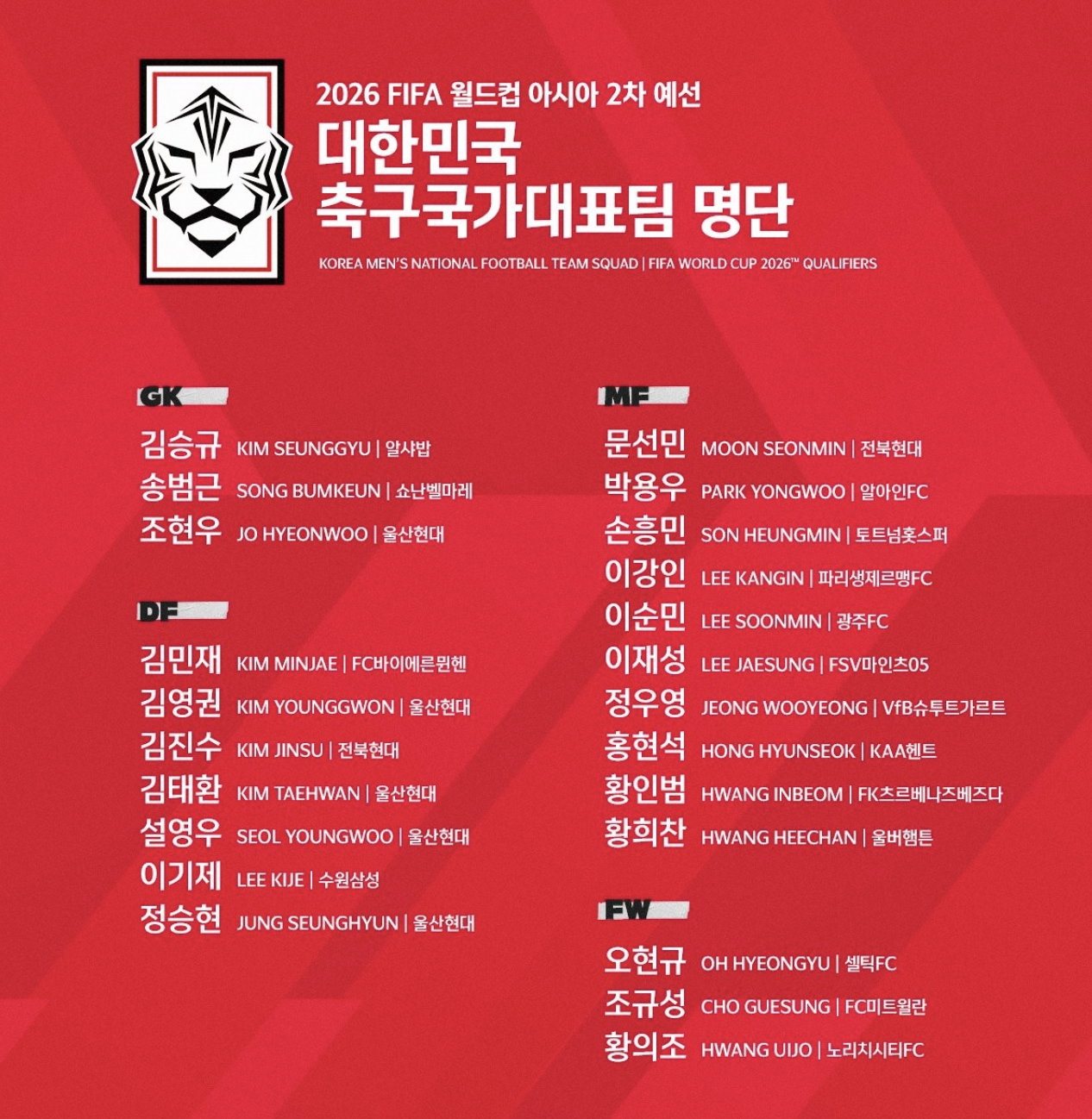 대한민국 축구 국가대표팀의 주장 손흥민과 김민재, 이강인, 황희찬, 이재성, 조규성 등과 K리그의 선수들이 선수명단에 이름을 올렸습니다. 특히, 부상으로 출전을 하지 못했던 송범근 골키퍼가 대표팀에 복귀하여 눈길을 끌었습니다. 다음은 2026 FIFA 북중미 월드컵 아시아 2차예선에 출전할 23명의 선수 명단입니다.
